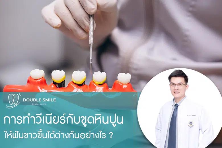 พูดถึงความแตกต่าง ของการรักษาด้วยการทำวีเนียร์กับการขูดหินปูนแล้ว มีข้อแตกต่างกันอย่างสิ้นเชิงเลยทีเดียว แต่ทั้ง 2 วิธีสามารถทำให้ฟันขาวขึ้นได้ทั้งคู่ อยากทราบไหมครับว่าการรักษาทั้งสองอย่างนี้แตกต่างกันอย่างไร หมอจะมาเล่าให้ฟังนะครับ วีเนียร์ เป็นการรักษาเพื่อแก้ปัญหาเกี่ยวกับรูปร่าง และสีของฟันโดยตรง ทำให้ฟันมีรูปร่าง และการเรียงตัวที่ดีขึ้น และสีฟันที่ขาวขึ้นตั้งแต่ขาวแบบเป็นธรรมชาติ หรือขาวมากๆเหมือนที่นางงาม และดาราชอบทำกัน เป็นการปรับรอยยิ้มให้สวยงาม โดยสามารถออกแบบตามความต้องการของคนไข้ได้ครับ